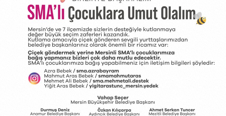 Mersin’de yaşayan ve SMA hastalığıyla mücadele eden Azra, Mahmut Aras, Mehmet Ali ve Yiğit Aras bebek için yapılan çağrıya Anamur Belediye Başkanı Durmuş Deniz, Aydıncık Belediye Başkanı Özkan Kılıçarpa, Mezitli Belediye Başkanı Ahmet Serkan Tuncer, Silifke Belediye Başkanı Mustafa Turgut, Tarsus Belediye Başkanı Ali Boltaç, Toroslar Belediye Başkanı Abdurrahman Yıldız ve Yenişehir Belediye Başkanı Abdullah Özyiğit de destek verdi.